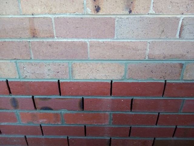 You can see the existing face and cream cement plastered over the brick inside the corbeled triangle. The clean outside face was made by grinding the face off the brick and mortar. This has made the face of the brick very susceptible to water ingress. As the face is now softer the water ingress will allow frost damage which will start to crumble the face of the brick over a period of time. This has been done by an inexperienced person. The wall is in a frost prone area. Photo taken Nov 23