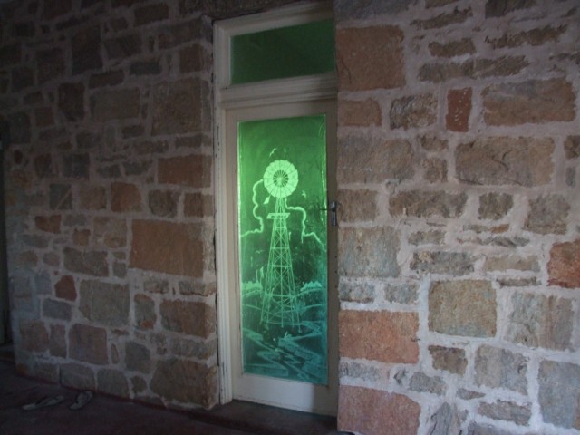 The back door had a windmill etched into the glass. The front door frame had stained windows on the left and right side of the door. The front elevation is facing due west and as the sun moves through its north and south cycle it highlights the window from the red to green on the windmill.