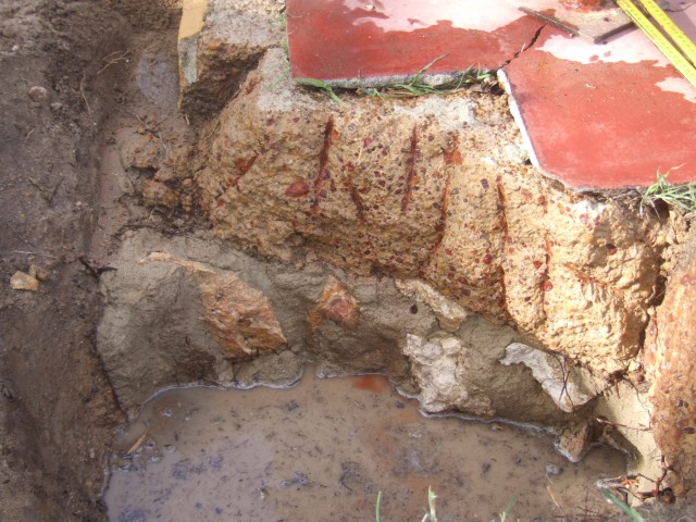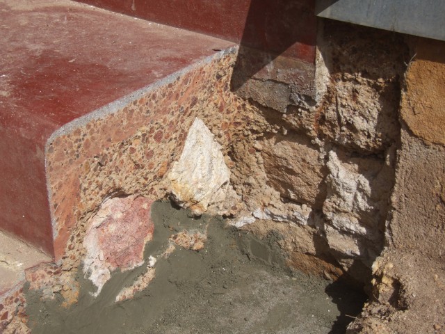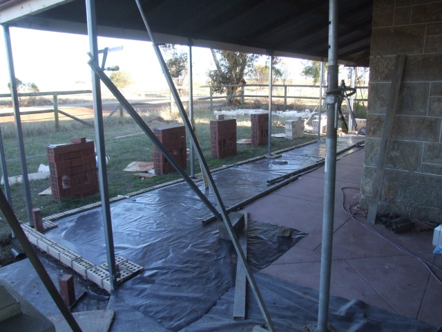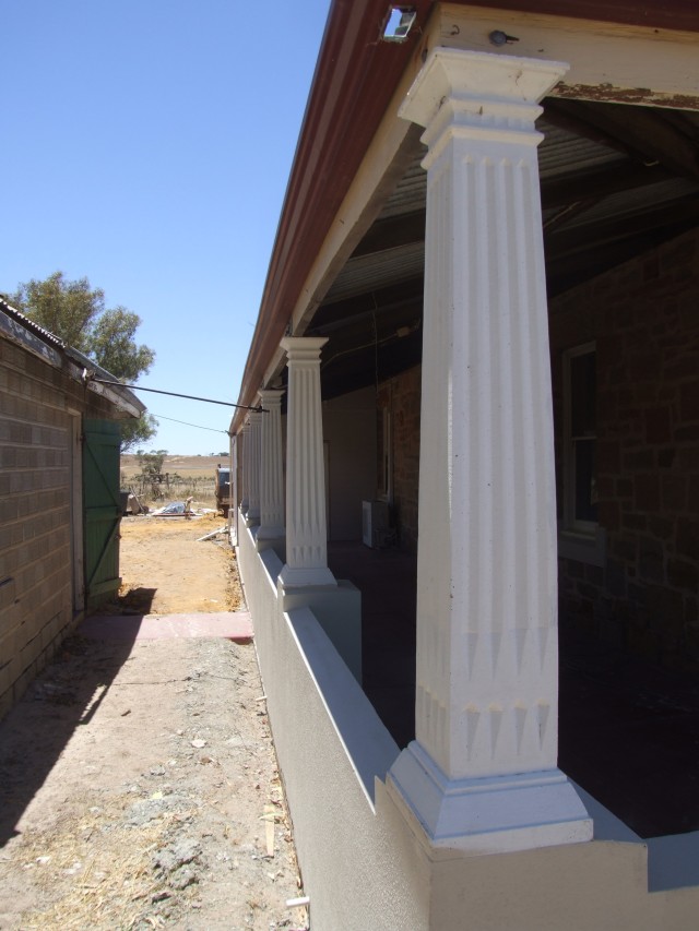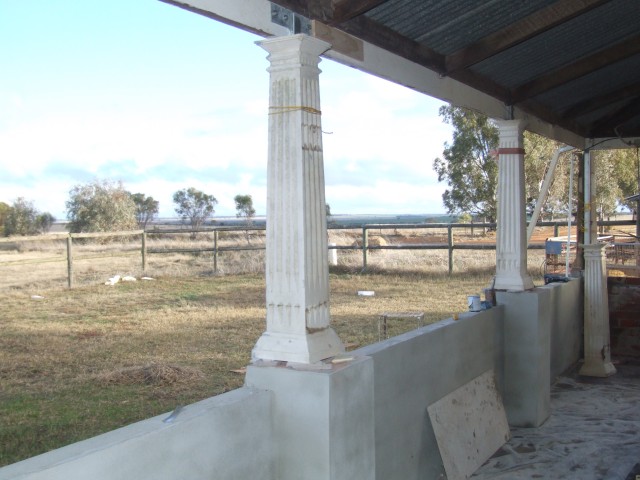The verandahs perimeter is made up of a 600mm x 300mm stone footing plus another 200mm layer of gravel and cement. The main verandah floor area is 100mm thick. The final finish is a traditional monolithic concrete mixed with a graded fine granite aggregate and cement. This was a traditional plasterers job. and actually required a high degree of skill and strength to achieve a polished finish.